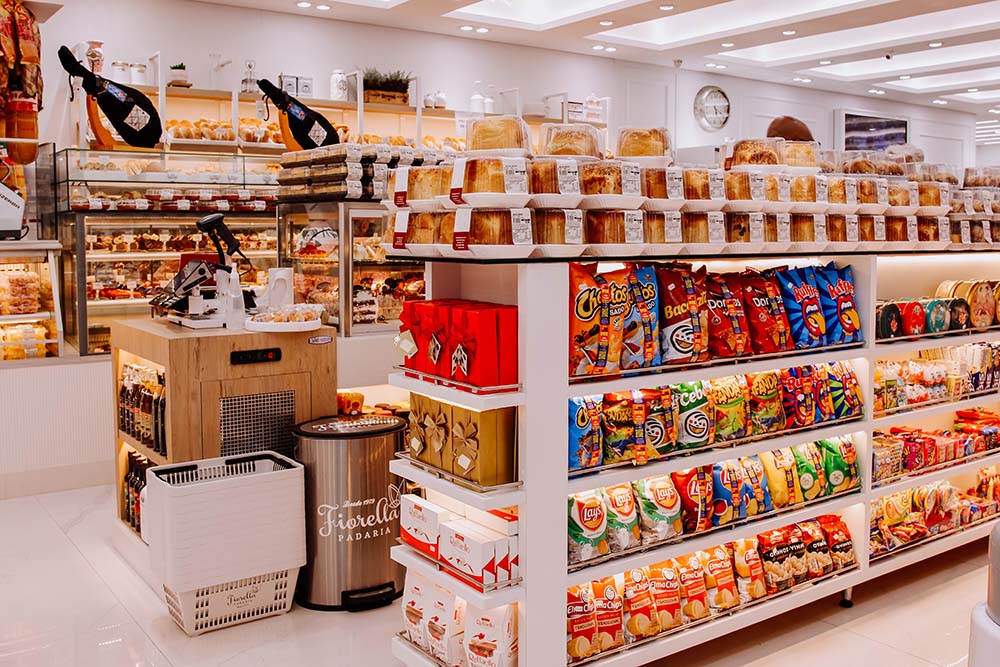 Vitrines de pães, salgados e doces